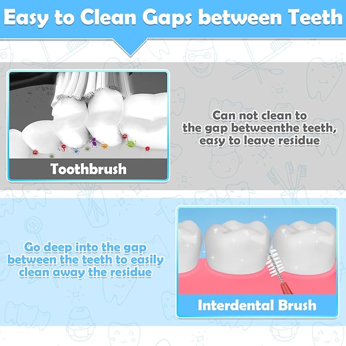 - 【Efficient Oral Cleaning】The interdental brushes with soft bristles can easily clean the food residue, tartar, etc. between the teeth that the toothbrush cannot clean. Help your teeth keep healthy and white. The dental brush can be inserted directly between the teeth to clean up the residue effectively. The 360° bendable brush head can easily clean the blind corners of the braces, crowns, bridges, dental implants, and teeth.