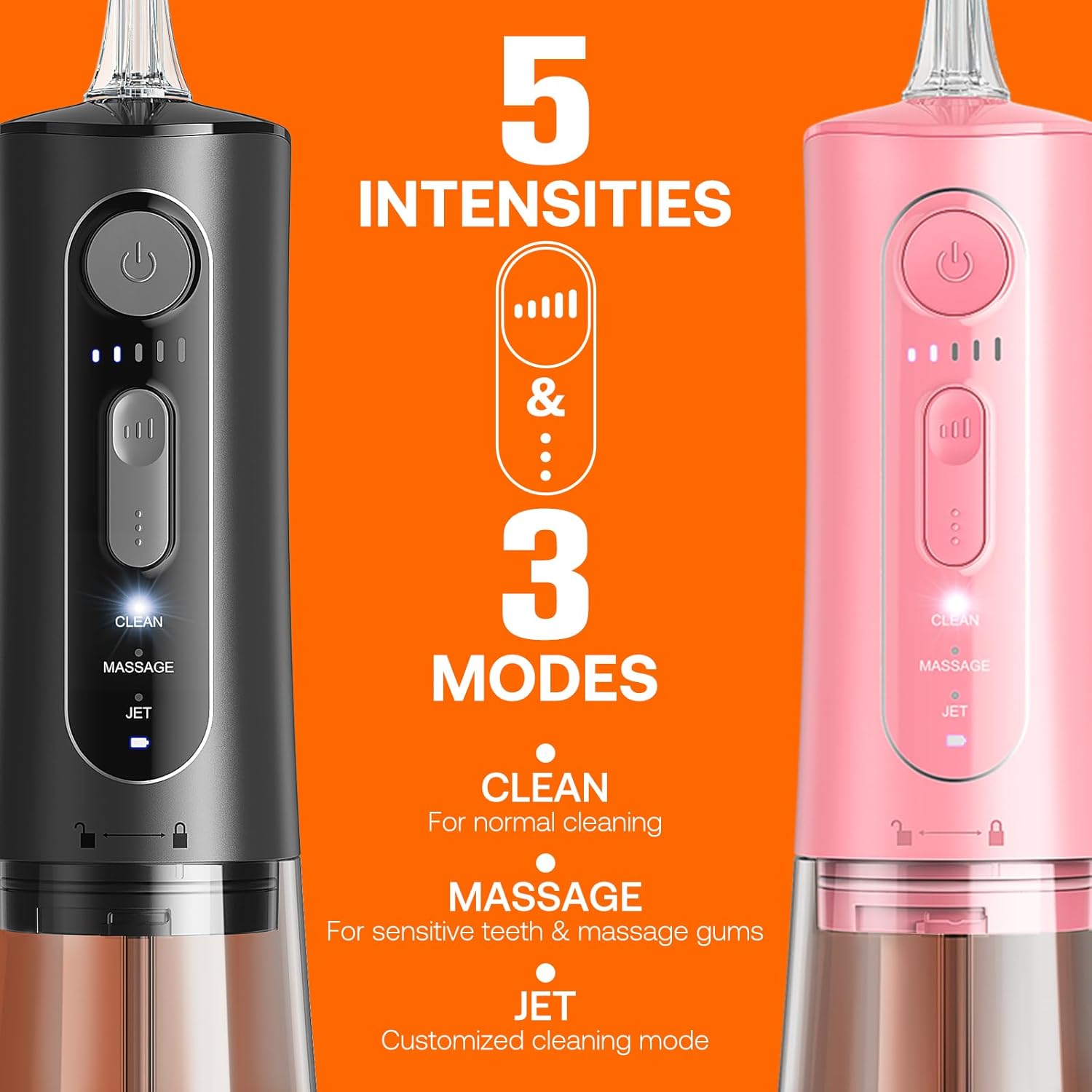 - Upgrade to a 40-day Battery Life for a Worry-free Travel Experience:Charges for just 4 hours and enjoys 40 days of powerful use. This cordless oral Irrigator comes with a DC USB cable which is compatible with 5V1A adapter or applicable to a USB port, such as power bank, laptop, etc