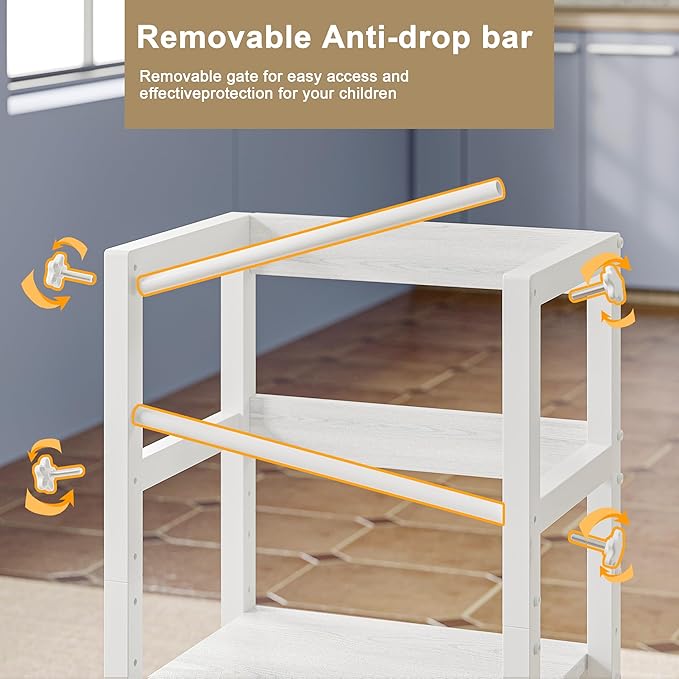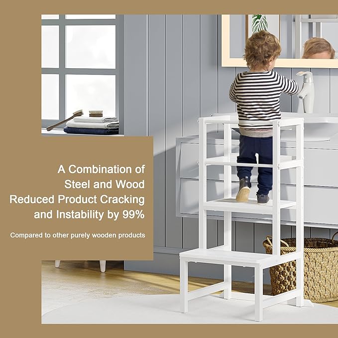 Kitchen Step Stool for Toddlers, Height Adjustable Toddler Tower with Safety Rail, Steel and Wood Toddler Kitchen Stool Helper Kids, Stool for Kids, Learning Tower, Kids' Desk White