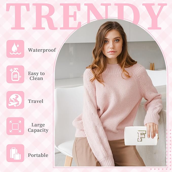 Small Initial Patch Makeup Bag Personalized Gifts Make Up Bag,White Cute PU Leather Glitter Letter Cosmetic Bag with Zipper,Trendy Portable Travel Toiletry Pouch,Preppy Stuff for Teen Girls Women F