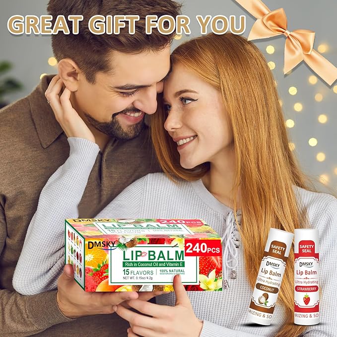 DMSKY 240 Pack Lip Balm, Natural Lip Balm Bulk with Vitamin E and Coconut Oil, Christmas Stocking Stuffers, Christmas Gifts for Women Girls-12 Flavors
