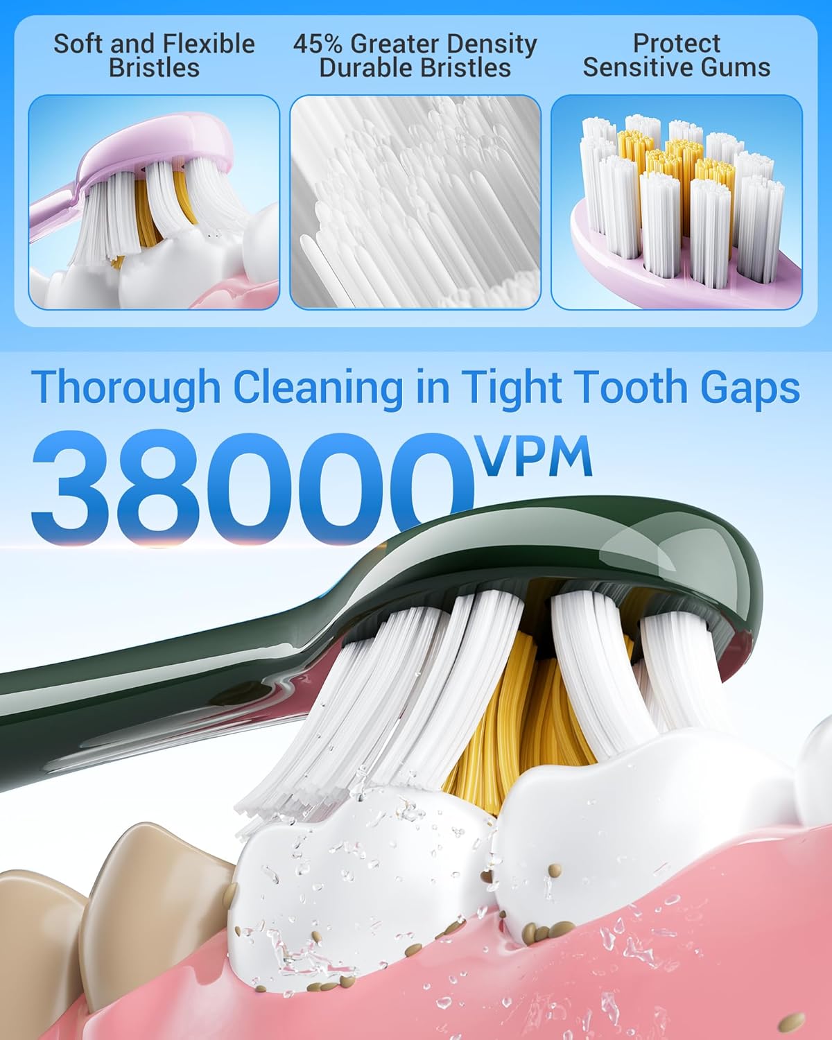 - Powerful Cleaning:This powerful electric toothbrush. Compared to a manual toothbrush, it delivers up to 38000 washes per minute and effectively removes food debris from the gum. Use a noise-cancelling yet powerful toothbrush for a thorough deep clean. Whiten teeth and improve oral health in two weeks