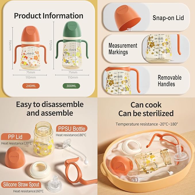 - ★Easy to Assemble & Wash: All parts of this baby sippy cup with straw are removable to facilitate thorough cleaning, which is safe for use in dishwasher (top rack only), electric and microwave sterilizers, or boiling water.