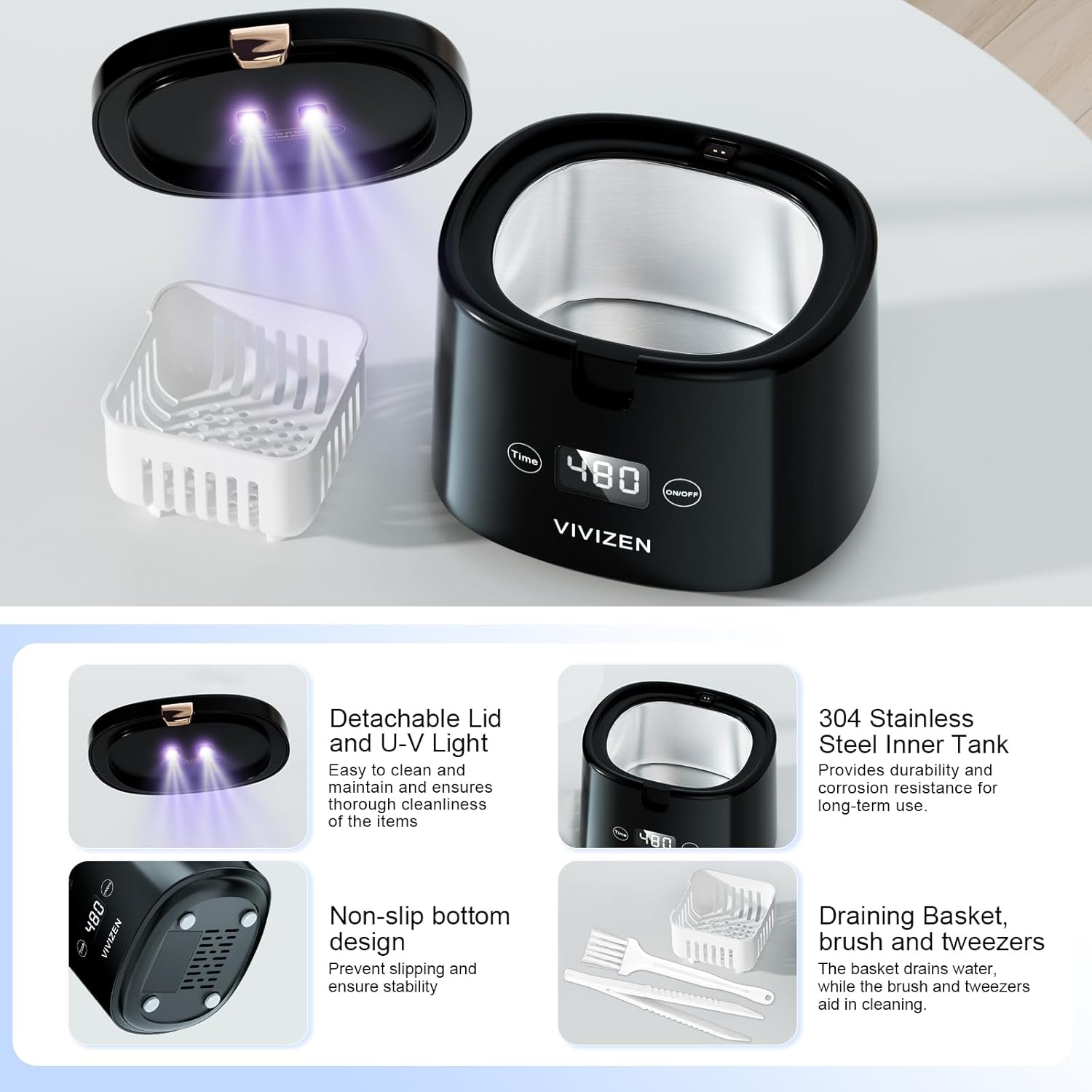 - [Professional and Efficient Cleaning] VIVIZEN Ultrasonic Retainer Cleaner utilizes 45,000Hz sound wave technology to effortlessly eliminate surface particles and dirt, ensuring a thorough 360° all-round deep clean for all dental appliances.