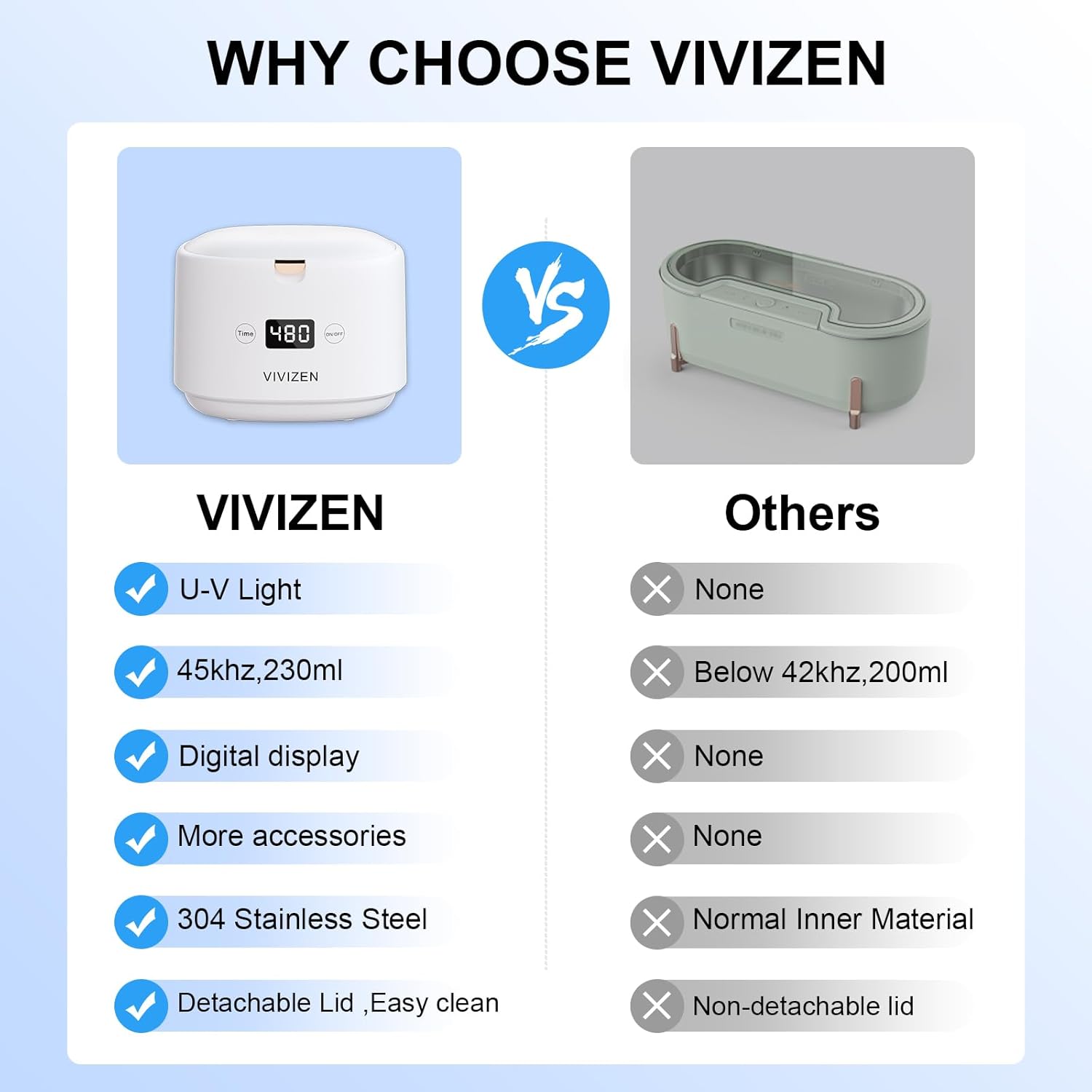 - [Professional and Efficient Cleaning] VIVIZEN ultrasonic retainer cleaner utilizes 45,000Hz sound wave technology to effortlessly eliminate surface particles and dirt, ensuring a thorough 360° all-round deep clean. Ideal for aligners, braces, mouth guards, and jewelry, this powerful 30W retainer cleaner reaches inaccessible areas for a pristine finish.