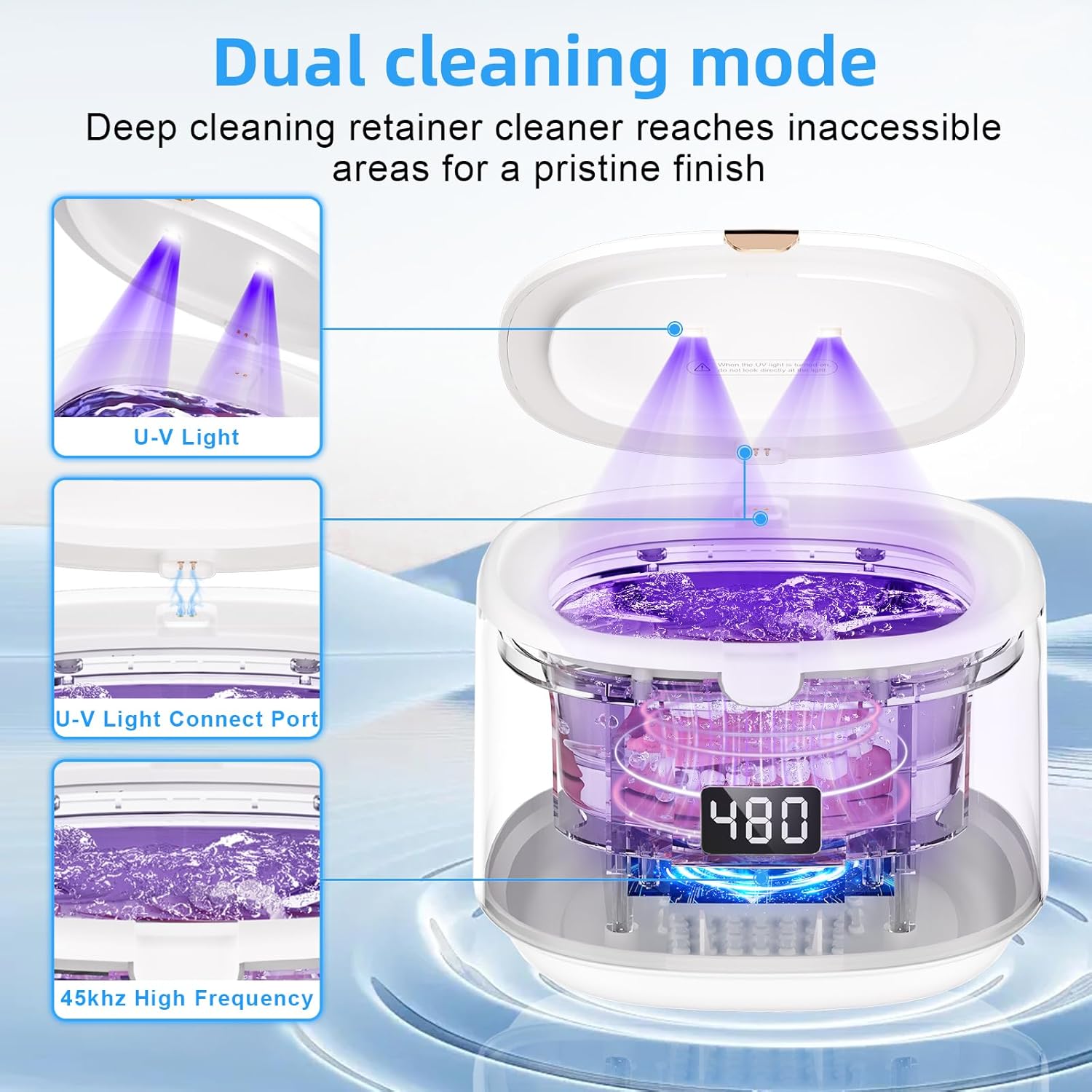 - [Customizable Cleaning 5 Modes] With various cleaning modes, our ultrasonic retainer cleaner suits a range of items including aligners, braces, mouth guards. Users can easily select the cleaning time length (90s, 180s, 280s, 380s, 480s) and opt for the deep cleaning mode, resulting in restored items that look as good as new.