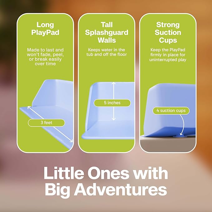 - SECURE HOLD, NO SLIPPING OR LEAKING. The ultra-strong suction cups ensure the PlayPad bathtub and shower splash guard stays firmly in place, providing a safe and stable surface no matter how much your kids move around. This bath shelf is designed to keep the fun in the tub and the mess out of your way.