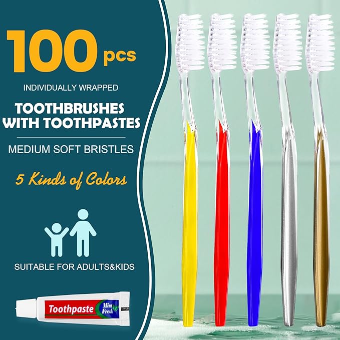 Navona 100 PCS Travel Toothbrush and Toothpaste Set, Travel Toothpaste, Bulk Toothpastes, Individually Wrapped Bulk Toothbrush, Ergonomics Handle,Medium Soft Bristle, Perfect for Hotel