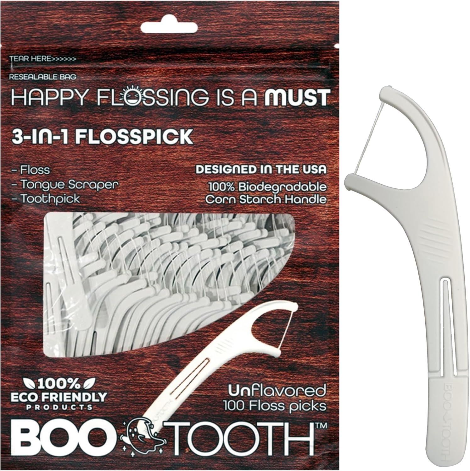 World’s First Eco-Friendly 3-in-1 Dental Floss Pick – Thin Flosser with Foldable Toothpick & Tongue Scraper – 100 Count, Biodegradable, Unflavored 100 Picks