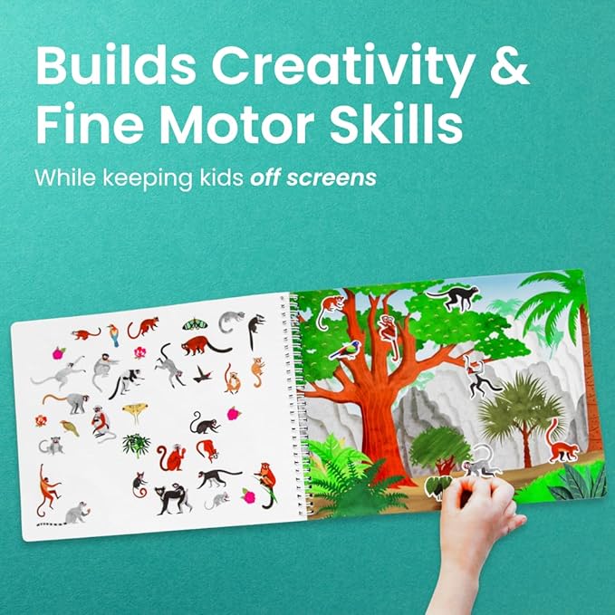 - Learn through play: Kids build fine motor skills, explore spatial awareness, and strengthen hand-eye coordination as they peel and stick stickers onto colorful scenes! Engaging in conversations about the sticker book characters will help imaginations run wild & encourage make-believe and pretend that can foster bonds between you and your child. Go ahead - play on!