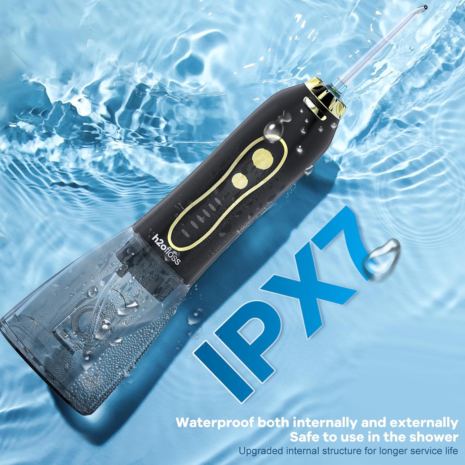 H2ofloss Water Dental Flosser Teeth Pick -Portable Oral Irrigator with 5 Modes, Rechargeable IPX7 Waterproof Orthodontic Teeth Cleaner Pick Cordless for Home Travel-300ml Water Tank Gold
