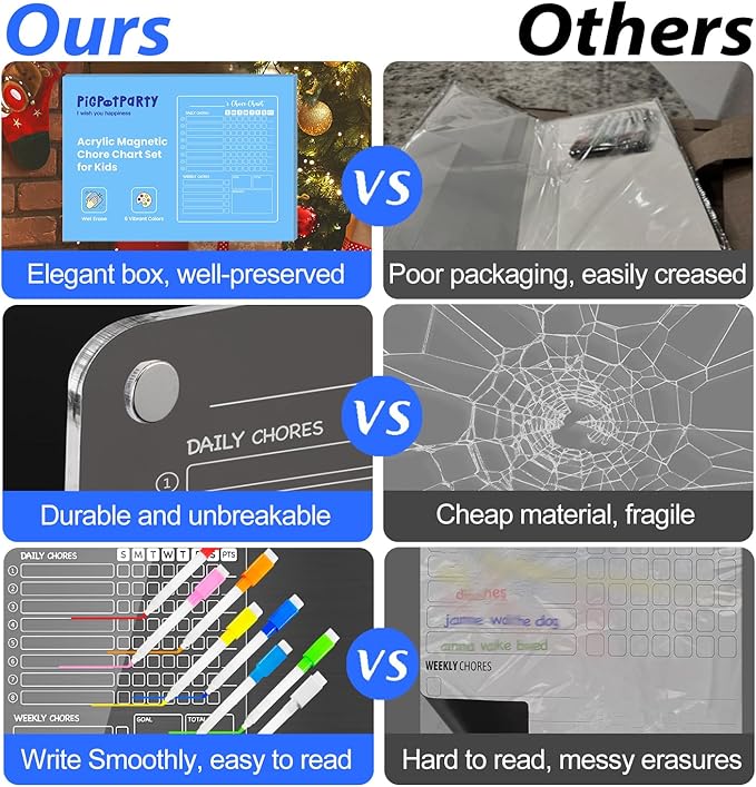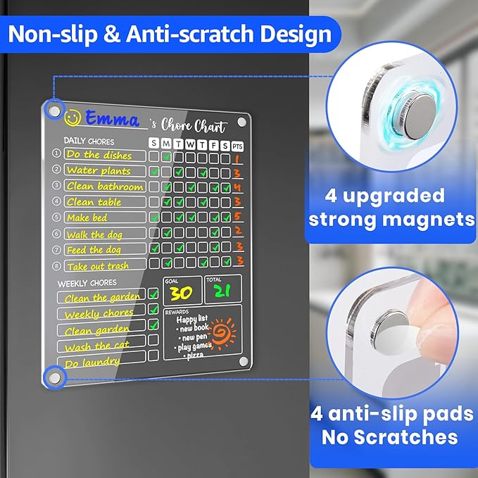 - Fun & Motivating Point System: Make kids chores fun with our acrylic chore chart! Set goals, track progress, earn points and reward kids by completing tasks. Perfect for building responsibility and positive habits in an engaging way