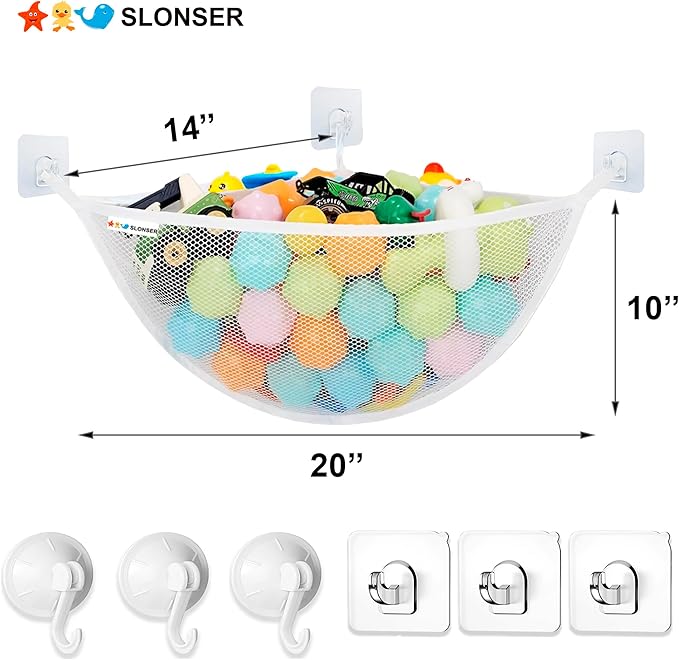 Bath Toy Holder Corner, Kids Bath Toy Net for Tub, Bathtub Holder Basket, Storage Bin Hammock Organizer, Shower Caddy Hanging Mesh Bag, Baby Bathroom Storage with 3 Suction Cups 3 Adhesive Wall Hooks