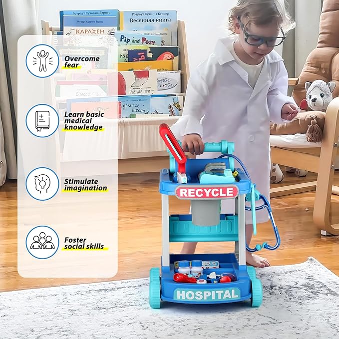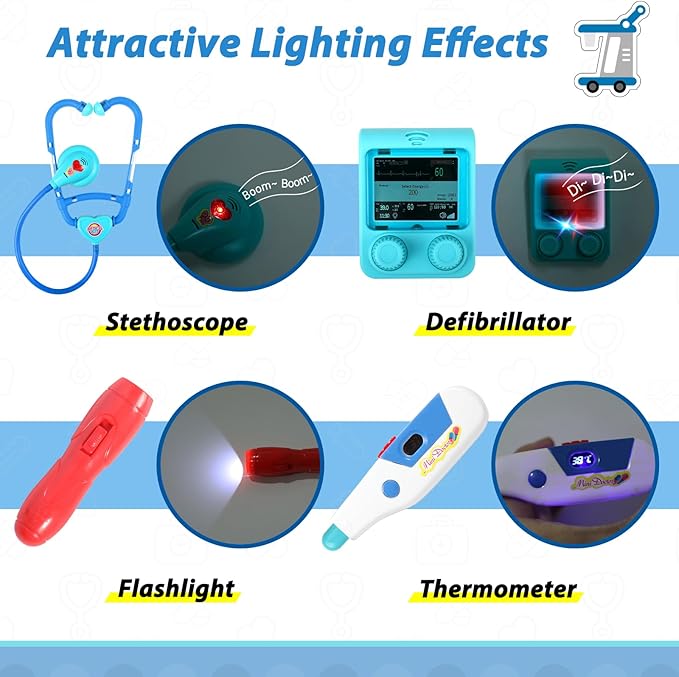 - LIKE A REAL DOCTOR: Liberry kids' doctor cart imitates the appearance of a real cart. Doctor costumes and medical tools with sound and light effects, allow your child to experience the fun of being a doctor