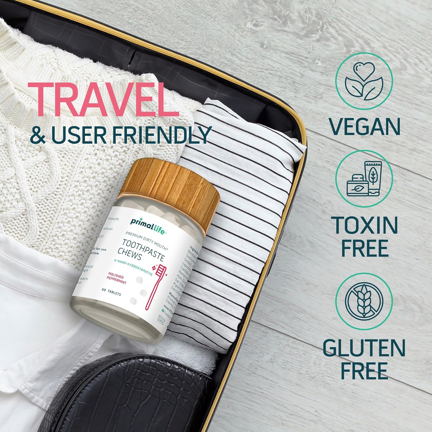 Primal Life Organics Premium Dirty Mouth Toothpaste Chews – Nano-Hydroxyapatite Whitening Toothpaste Tablets for Adults - Gluten Free, Vegan, Paleo - 60 Tablets in Jar - Polished Peppermint