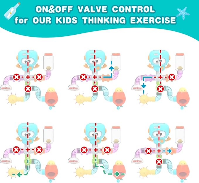 - Interactive Bath Toy For Babies: Creative bath toys for toddlers age 3+. This Bathtub Toy set encourages creative play and exploration with its colorful pipes, cups, valves, and more. Watch your ittle one's eyes light up as they discover how to connect the pipes, pour water through the valves, and fill up the cups.