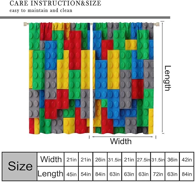 Kids Building Blocks Toy Curtains for Kids Room W42 x L45 Inch Rod Pocket Contour Plastic Colorful Toy Bricks Geometric Print Pattern Curtains for Boys Girls Bedroom 2 Panels
