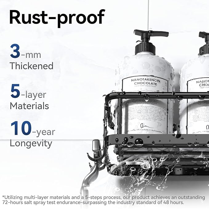 - 304 Grade Stainless Steel: 3mm reinforced wires and 5-Layer rustproof armor coating, survived 72hr ASTM B117 salt spray & 10,000 bend tests. 2X longer lifespan than basic shower shelf for inside shower