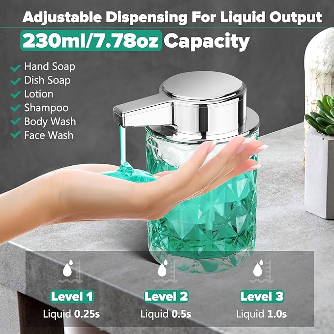 Automatic Soap Dispenser Liquid for Kitchen: 8 OZ Glass Touchless Clear Auto Soap Dispenser for Bathroom - Hand Dish Lotion Home Countertop Kids - Family Couple
