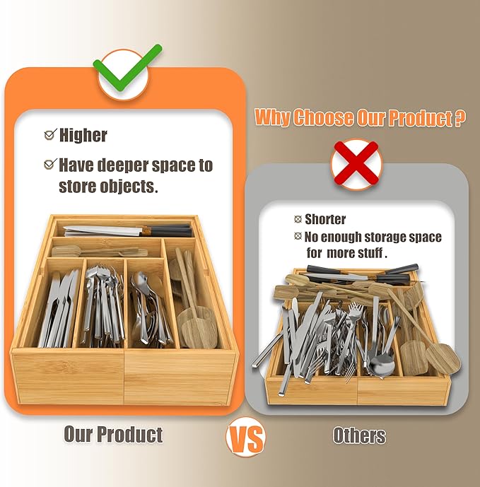 - Premium Tall Design: At 3.9 inches in depth, our bamboo drawer organizer offers greater storage capacity, providing ample space for a variety of utensils, tools, and accessories, ensuring everything stays organized and within easy reach. 12.52–22.64 W x 16.1 D x 3.94 H inches. Please measure your drawer height (>3.94 in) and width (>12.6 in) before ordering