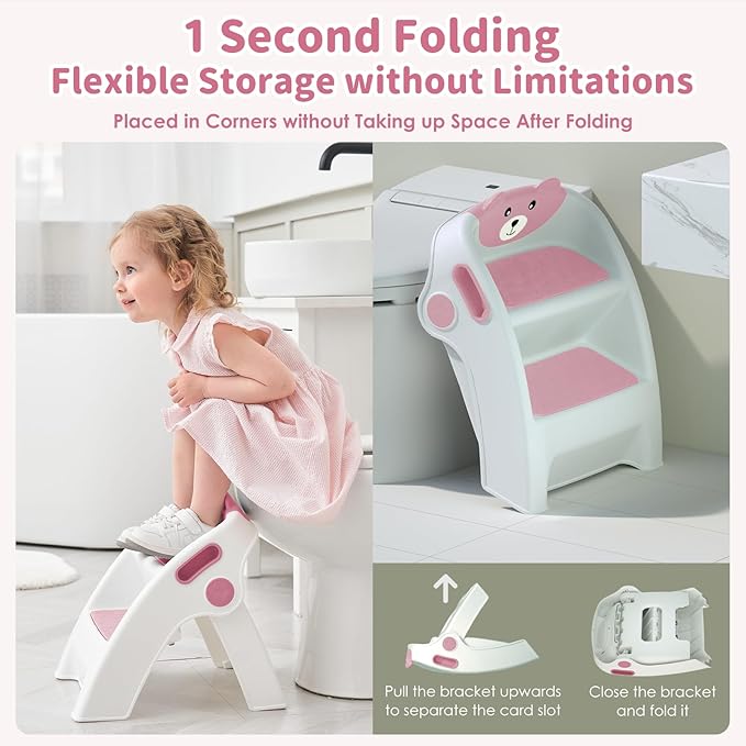 Toddler Step Stool Foldable 2 Step Stool for Kids Collapsible Anti-Slip Stepping Stool for Bathroom Sink Potty Toilet Toddler Kitchen Stool Helper (Pink)