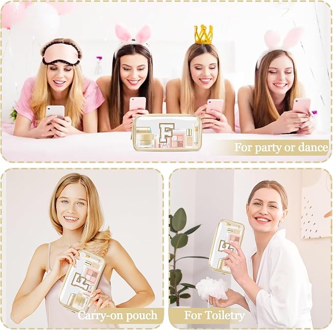 - 👛【Personalized Letter Design】The Clear makeup Pouch is designed with stitched glitter Chenille letters, you don't have to worry about it falling off. The unique Chenille 26 letter design, sparkling gold borders, and cute monogram patches have a strong personalized style, making your makeup bag the focus of attention.
