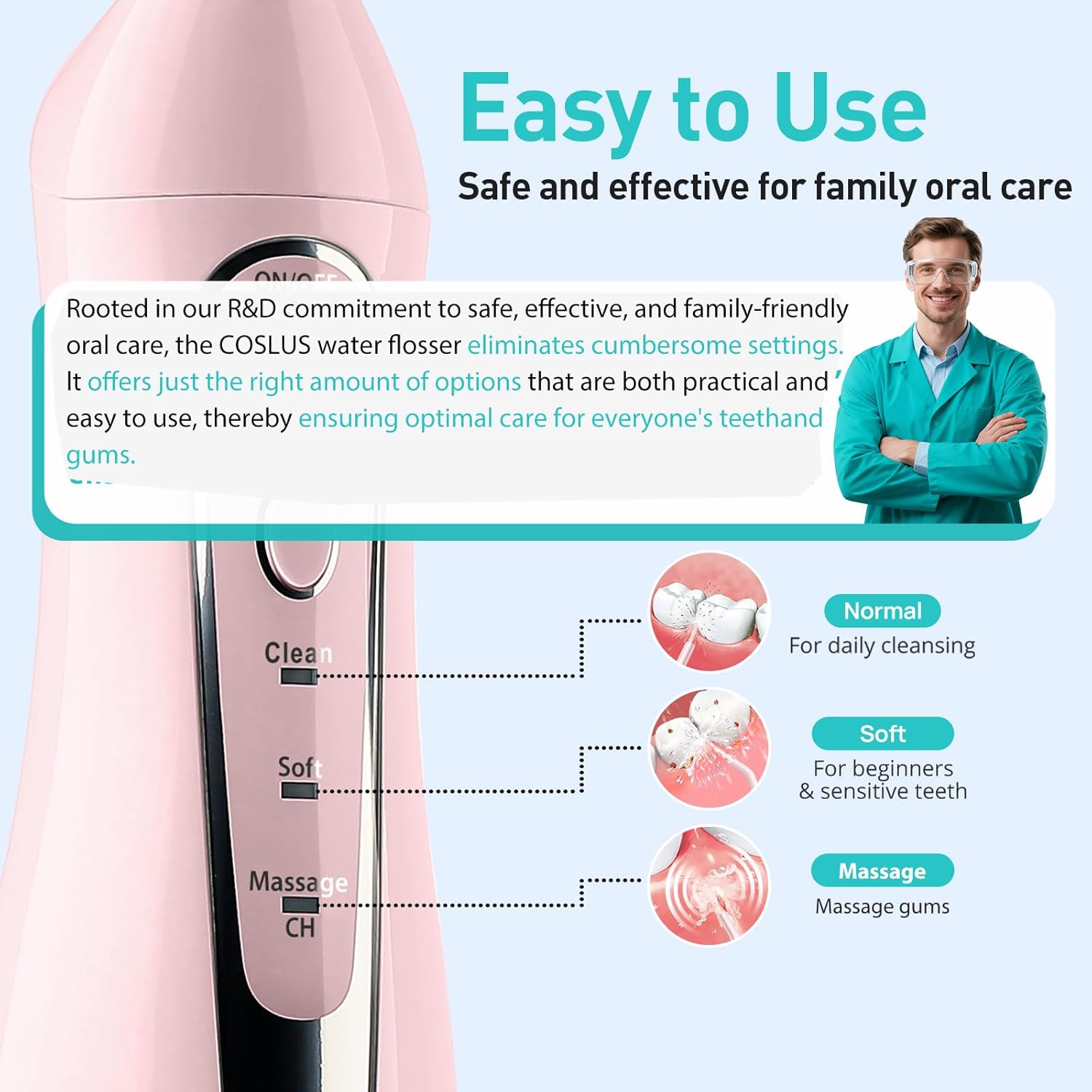 - Water Flossing Cleans Effectively for a Healthier Mouth: The COSLUS water flosser boasts advanced, safe, and effective 0.3mm+0.3mm ultra-fine dual-thread water pulse technology, developed and continually optimized by our research team over years of research and real user testing. This water dental pick delivers 1400-1800 high-pressure pulses per minute to target and dislodge plaque for a thorough clean. This water flosser also features multiple operation modes and multiple pressure settings to suit different oral conditions and users