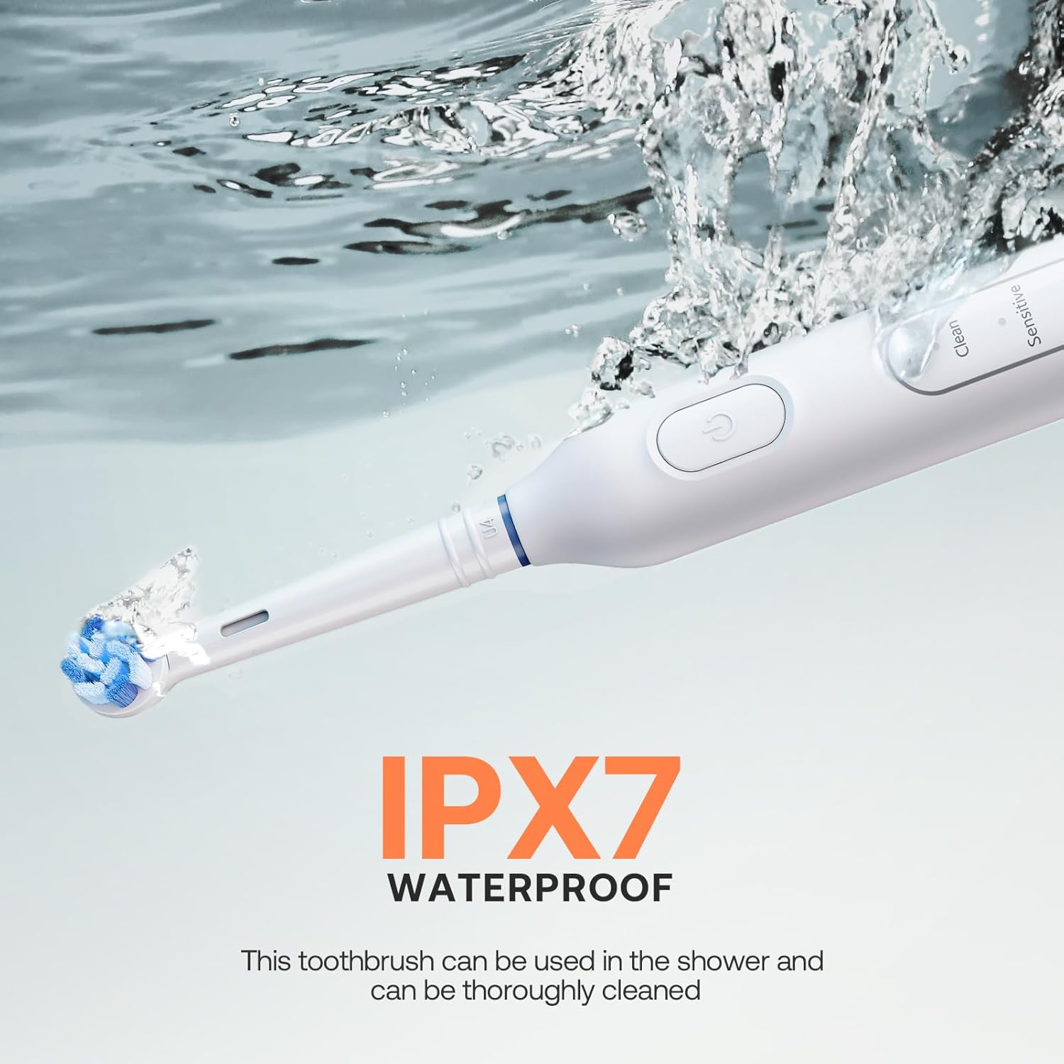 - 2-Minute Smart Timer & IPX7 Waterproof: With a built-in timer that pulses every 30s, this electric toothbrush ensures thorough cleaning by guiding your brushing routine across all mouth quadrants; It's waterproof design allows for easy use in the bathroom