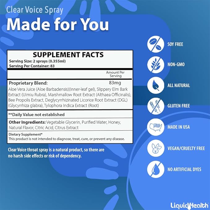 - Sing Better with USA Made Clear Voice! Have you ever tried to sing at band practice without a voice or vocal spray, or in the studio and your voice was not sounding quite right? There is no need to panic because of a pitchy, hoarse, or cracking voice. Clear Voice Vocal Throat Spray is made in the USA and designed to help soothe irritation, itching, and scratchiness in the throat.