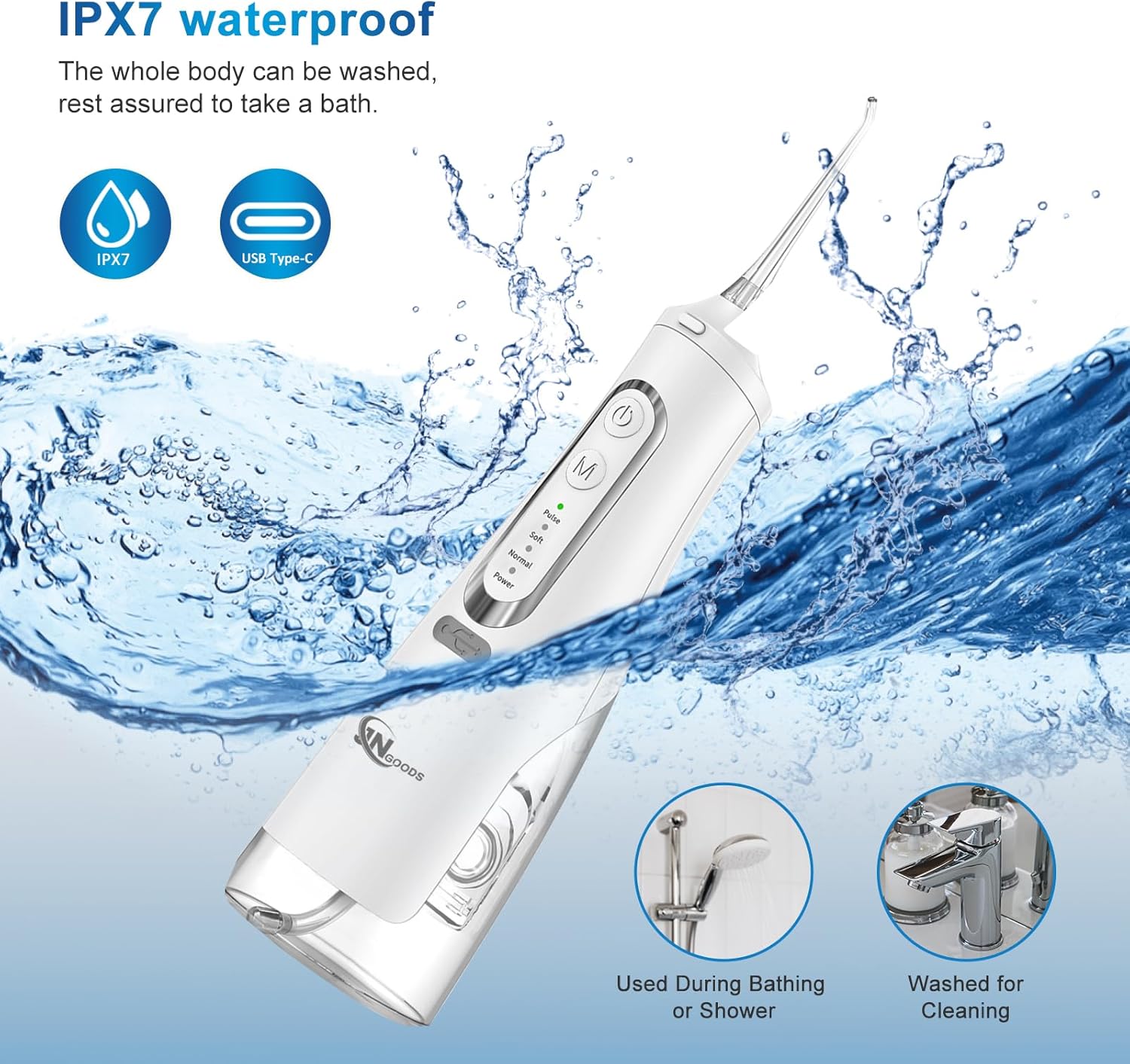 - 1. Powerful Battery &T IPX7 Waterproof : JNGOODS Water flosser With 2000mah powerful battery, fully charged need 4 hours and used continuously for about 25 days. Come with Type-C cable,(Adapter Not Included), applicable to a variety of charging equipements such as power bank, computer, laptop... With double-sealing rings, oral irrigator prevent water leakage reliably, can use for shower in the bathroom and it's washable to clean