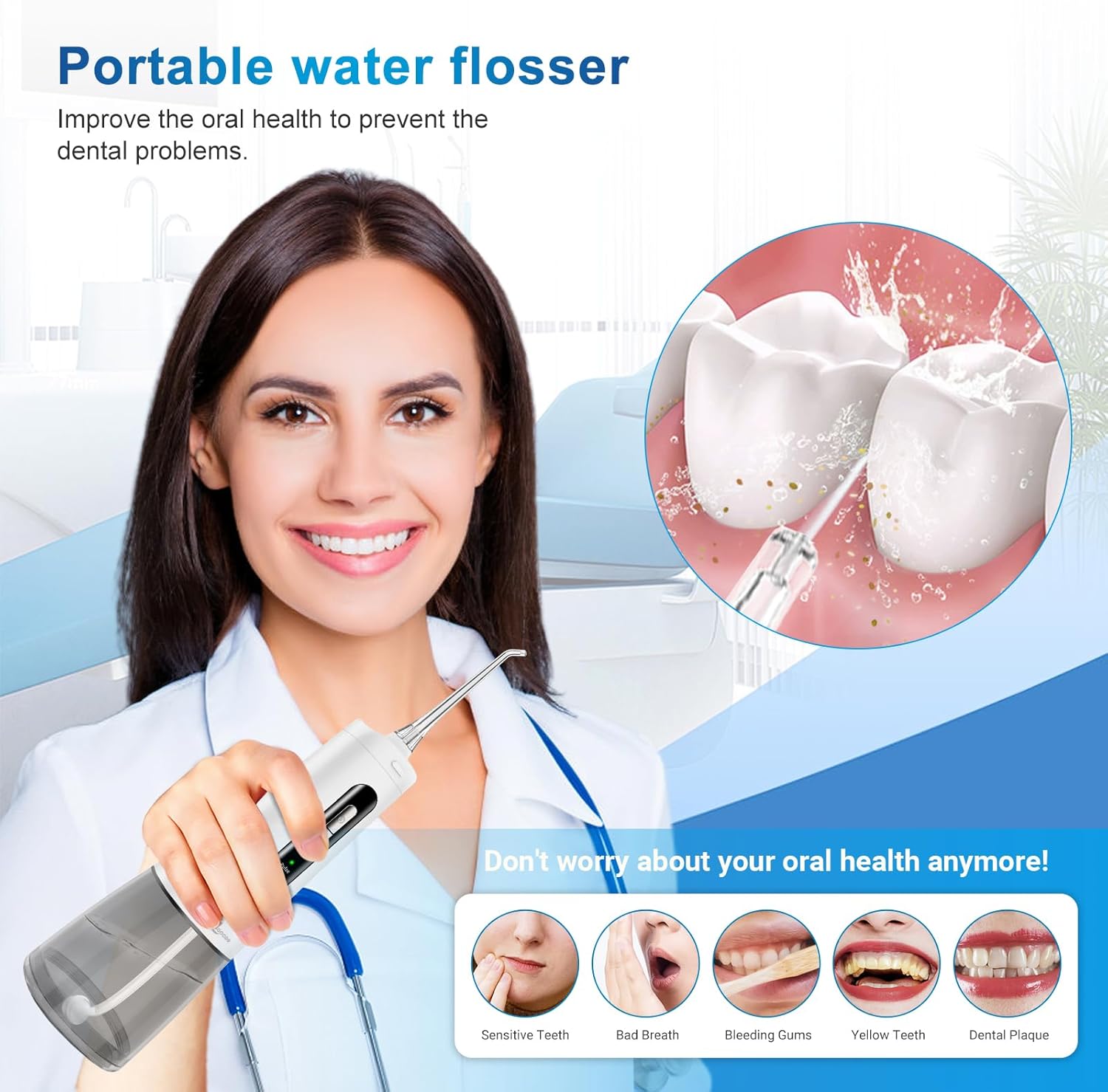 Cordless Water Dental Flosser Oral irrigator,JNGOODS 300ml Rechargeable Water flosser for Teeth IPX7 Waterproof 4 Modes Portable Oral Irrigator with 4 Jet Tips, Travel Home use (White)