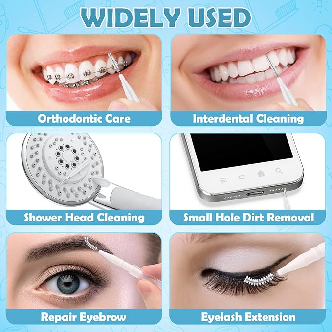 - 【More Uses】 Do not throw away used interdental brushes, you can also use them as shower head brushes to clean water nozzles, increase water flow, and maintain electronic devices such as phones, tablets, and small areas. Additionally, these brushes can be used as eyebrow brushes and eyelash brushes for precise shaping, extending eyelashes, and discovering more functions.