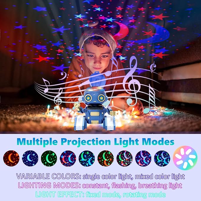 - ROBOT WITH PROJECTOR NIGHT LIGHT: The robot toy features an innovative projector function that projects 8 fascinating lights. Bedroom starry night light projector for kids is specially designed for children. Play with your child during the day and fall asleep at night