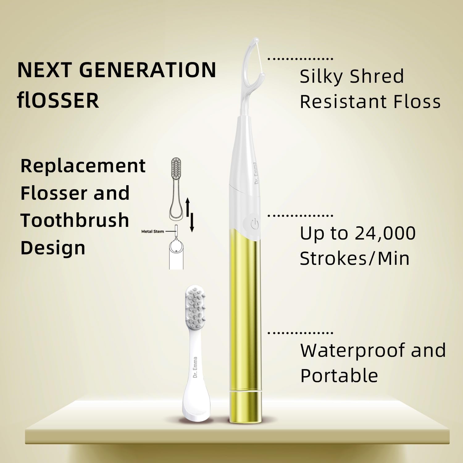 Dr. Emma Electric Vibration Flosser, Power Flosser for Adults, Gum Stimulator, Teeth Cleaner, Reusable Flossing Tool with Toothbrush, Water Flosser Alternative, Yellow