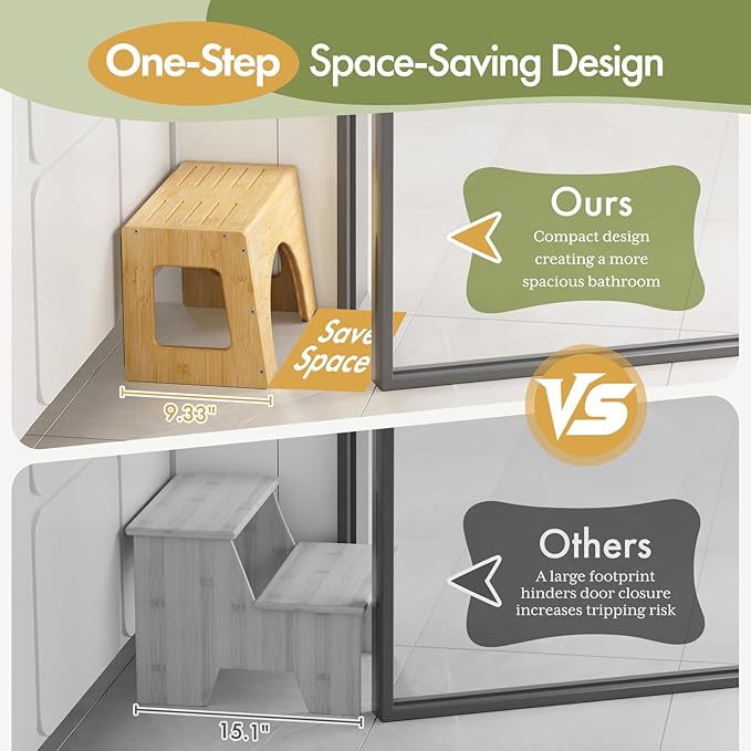 - Stylish and Durable Bamboo Construction: Crafted from 100% natural, odor-free bamboo, our step stool for toddlers elegantly combines aesthetics with health. With sturdy 0.59"/1.5 cm thick boards supporting up to 300 lbs, it suits toddlers and teenagers. Whether in the bathroom or any room, this versatile footstool adds a touch of natural beauty to your living space.