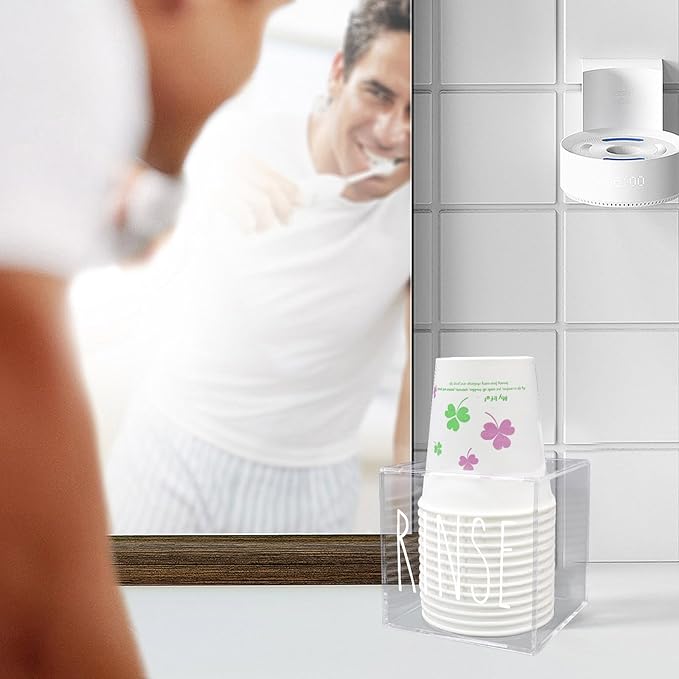 - Bathroom Cup Dispenser: Bathroom cup dispenser allow you to stack your bathroom cups without having to leave them scattered. When you need to use it, just easily pick one up from the top of the stacked bathroom cups. The disposable cup dispenser can also be placed on a bathroom kitchen farm counter or in a room to hold disposable cups, making it very easy to access when you need to rinse your mouth or drink water.