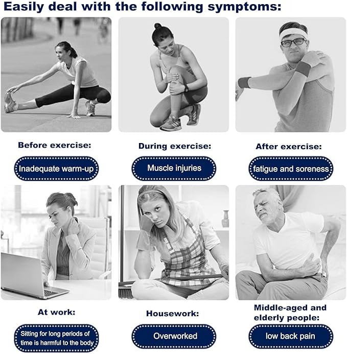 - 【Relieves various types of pain】: This multifunctional massage tool is suitable for relieving various types of pain. It is particularly helpful for rehabilitation after sports injuries, relieving physical and mental fatigue from sitting in the office, and treating muscle strain caused by high-intensity training. It can also be used for repair physiotherapy and pain relief during the surgery recovery period.