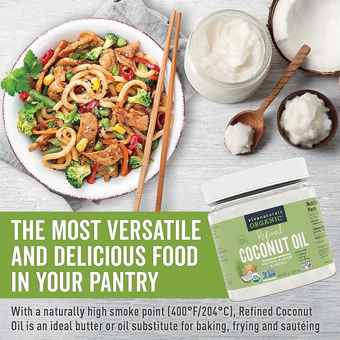 Viva Naturals Refined Coconut Oil, 16 fl oz – Expeller-Pressed, USDA Organic, Neutral Flavor & Aroma, Ideal for Cooking, Baking, Hair & Skin Moisturizer