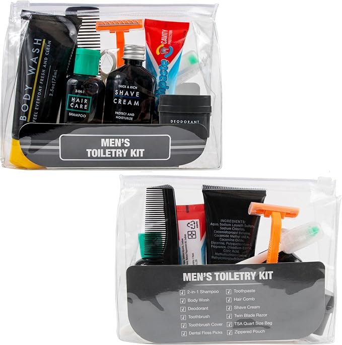- MEN’S HYGIENE KITS FOR HOMELESS IN BULK: 25 kits each contain: (1) 2-in-1 shampoo & conditioner, (1) body wash, (1) deodorant stick, (1) toothbrush with (1) protective cover, (1) anti-cavity toothpaste, (2) dental floss picks, (1) hair comb, (1) shaving cream, (1) twin blade razor. Plus, BONUS (1) TSA approved quart size reusable bag, & the (1) reusable zippered pouch it all comes in!