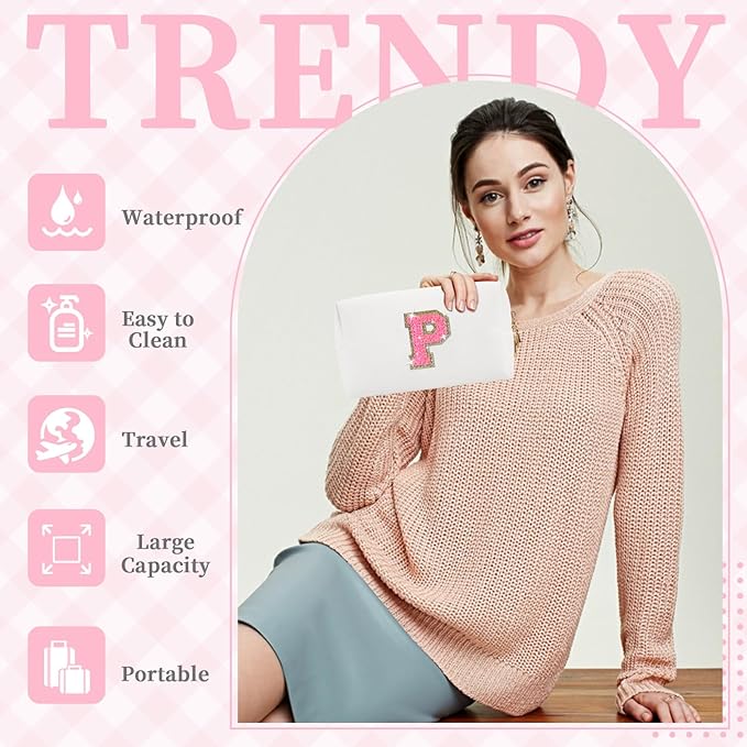 - 🏶【 Unique Design 】Preppy cosmetic bag with golden glittering chenille patch, fashionable and skin-friendly, comfortable to the touch. The cute letter pattern patch has a strong personalized style, which is sewn on this cosmetic bag, making the storage bag more eye-catching and adding a personalized atmosphere.