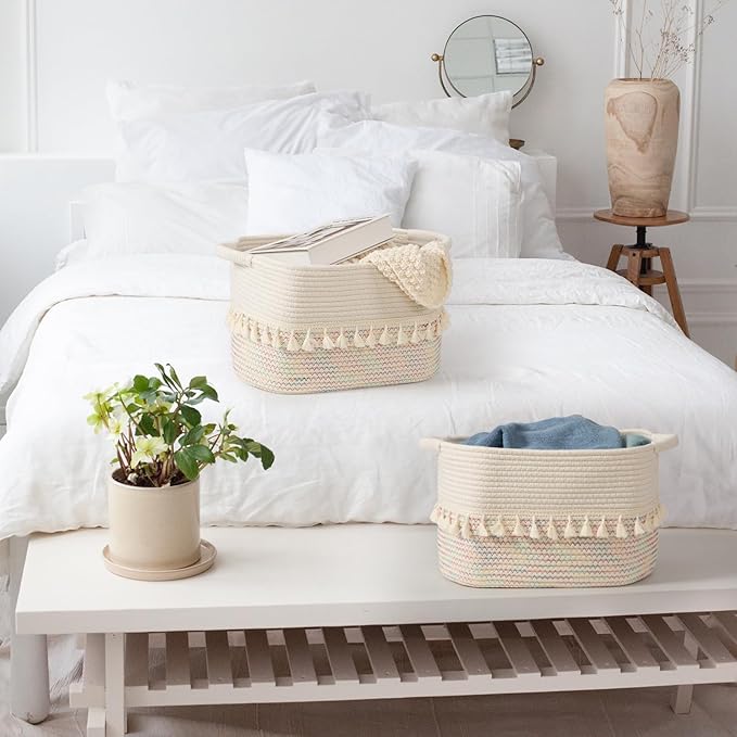- Solid and durable: Our boho storage baskets feature sturdy handles that make them easy to move around. Rope baskets stand the rigors of daily use. Thanks to a flexible and resilient cotton material, they can bounce back into shape after being folded