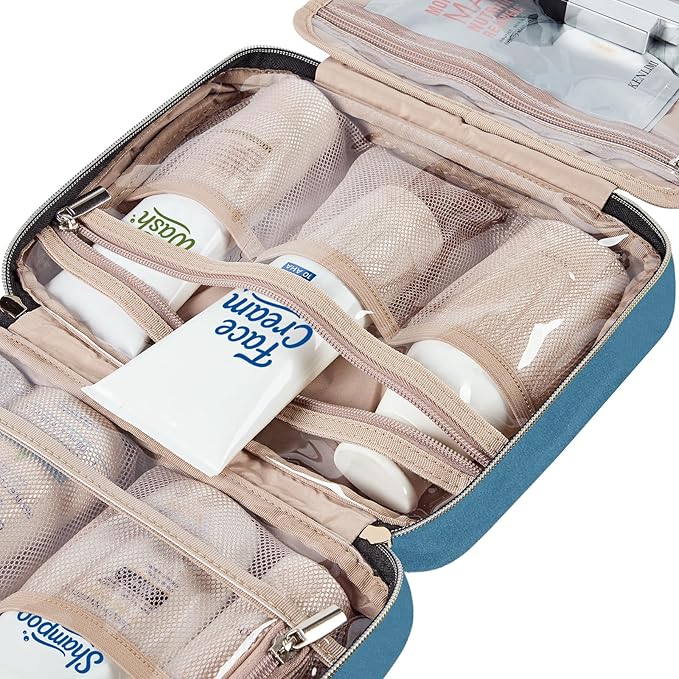 NISHEL Travel Toiletry Bag for women, Portable Hanging Organizer for Travel-Sized Shampoo, Conditioner, Brushes Set, Makeup Accessories, Medium Size, Lake-Blue