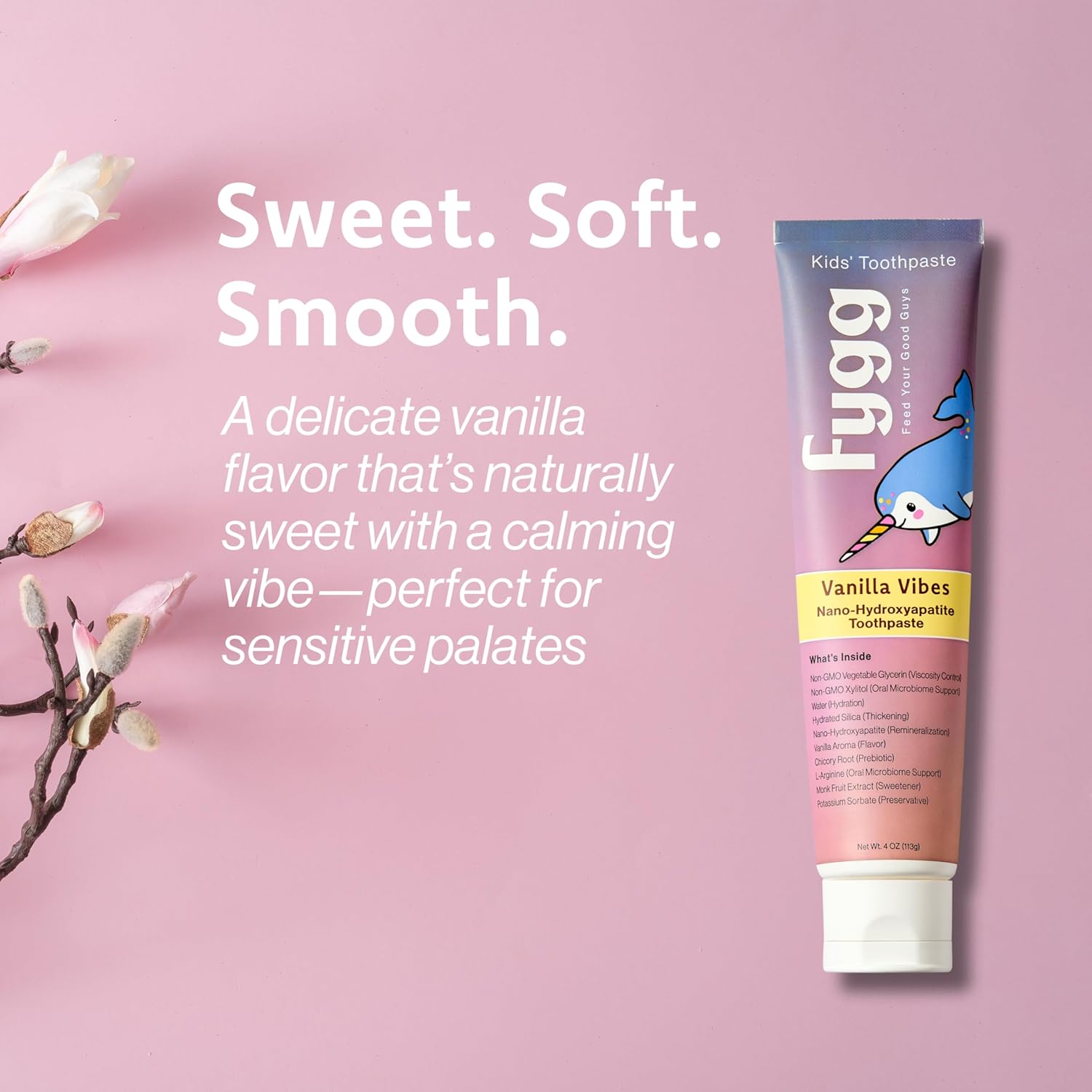 - Vanilla Vibes Kid's Toothpaste: Transform your child's brushing routine with Fygg kids nano hydroxyapatite toothpaste with tasty vanilla frosting flavor. Our kids remineralizing toothpaste is fluoride-free and safe if swallowed while providing a cavity-fighting shield.