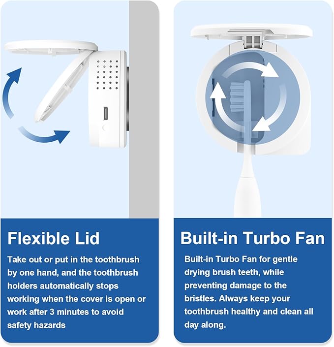 - ✅【3-minute Auto Work Protection】The portable toothbrush uv light adopts a fully automatic disinfection design. It can automatically work for 3 minutes each time by just close the cap. Built-in turbo heating fan works for gentle drying while preventing damage to the bristles.