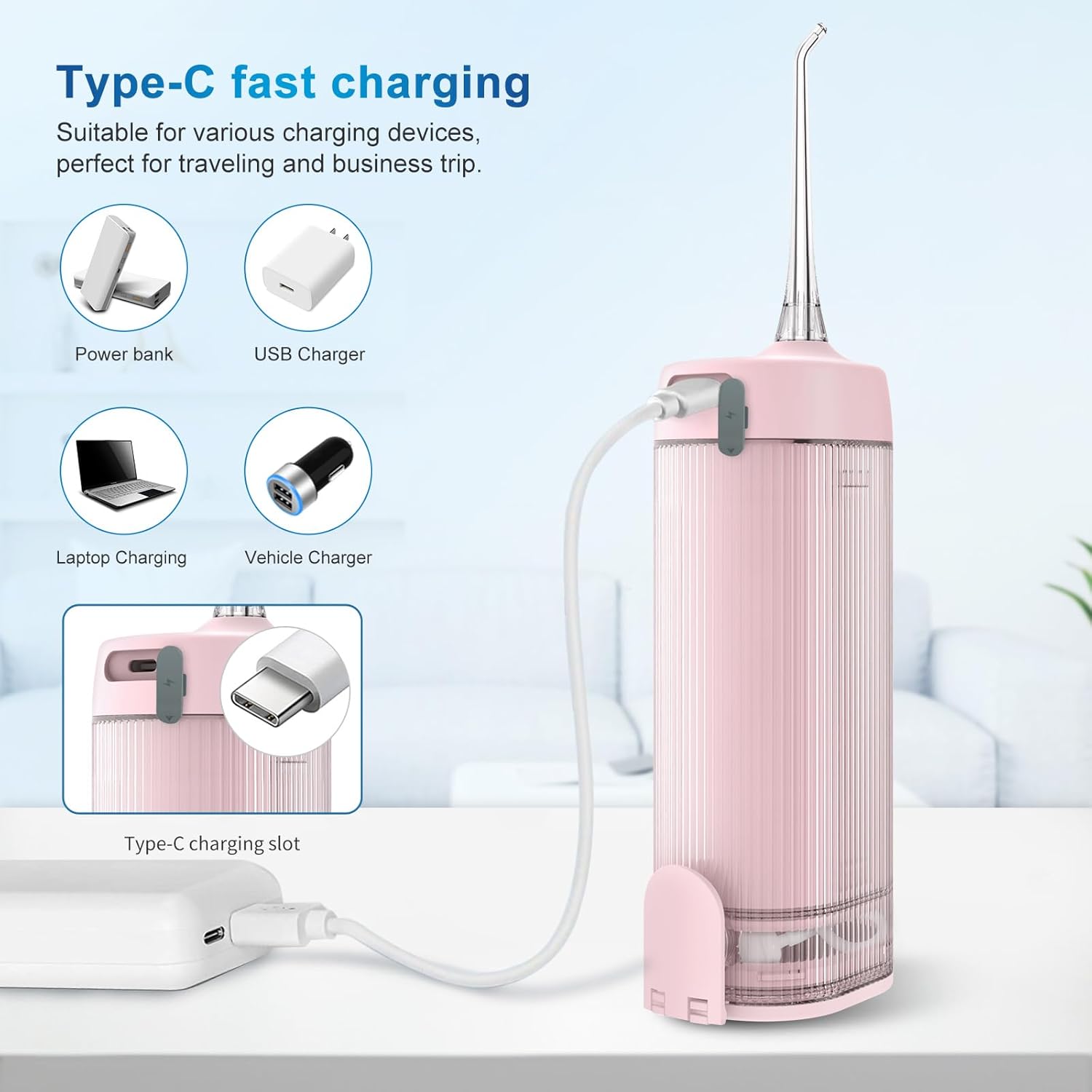 - 1. 5C Powerful Battery &T IPX7 Waterproof : JNGOODS Water flosser With 5C 1500mah powerful battery, fully charged need 4 hours and used continuously for about 25 days. Come with Type-C cable,(Adapter Not Included), applicable to a variety of charging equipements such as power bank, computer, laptop... With double-sealing rings, oral irrigator prevent water leakage reliably, can use for shower in the bathroom and it's washable to clean