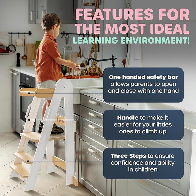 - GUIDE KIDS TO INDEPENDENCE with the Alacebelle Toddler Kitchen Stool Helper. This foldable kitchen stool for kids has a white and natural wood design that fits well in your home decor and creates a calm space for your child to learn and explore