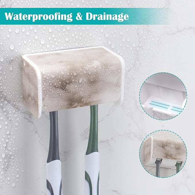 Toothbrush Holders Wall Mounted with Cover, Electric Tooth Brushing Holder for Bathroom, 2 Slots Self Adhesive Toothbrush Organizer, Toothbrush Stand for Family, Kids (1, White Marble)
