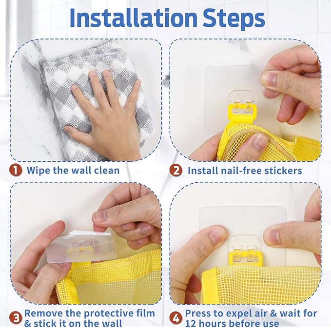 - [SUPERIOR WEIGHT-BEARING]: The bath tub toy holder is exclusively designed by our factory, carefully selected materials and accessories, comes with 6 strong no-nail stickers, very easy to install; After testing, this bath toy storage is load bearing 22 lb/10 kg for up to 180 days without falling off.