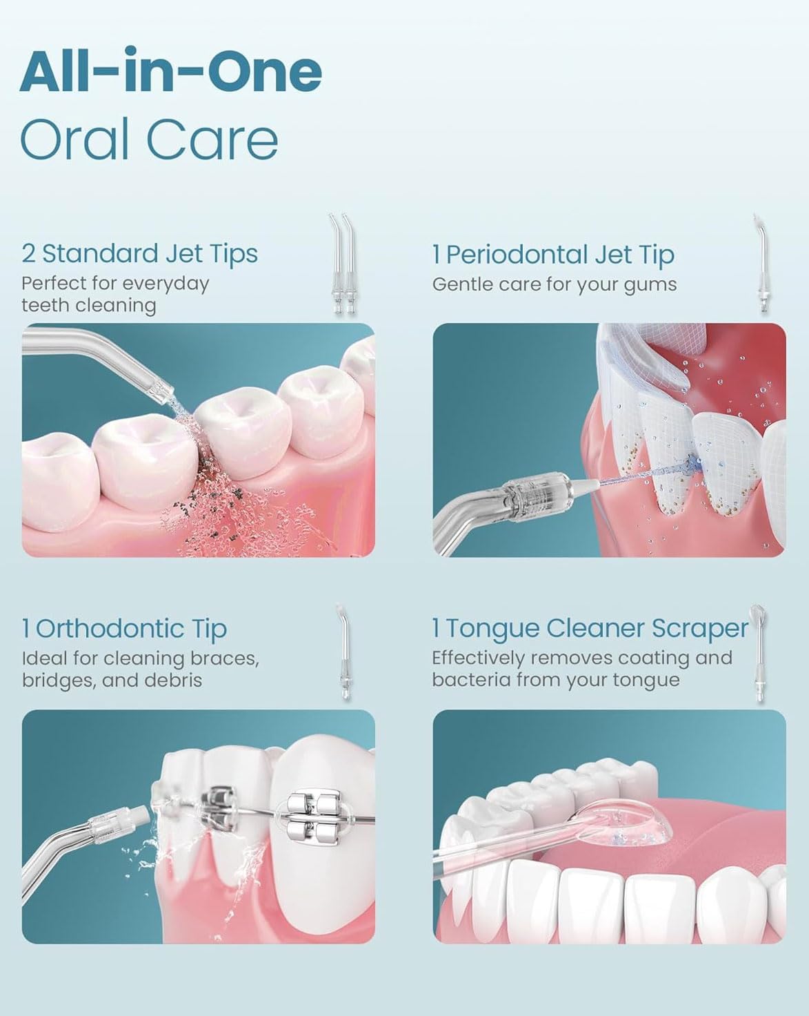 - Personalized Deep Cleaning: Onlyone water dental flosser has 4 pressure settings and 5 tips for tailored care from gentle to intense. It features a memory function to save your settings and operates quietly under 55dB for effective, personalized oral care
