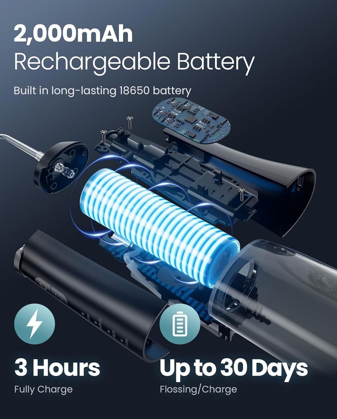 - Long-Lasting Battery, Portable Anywhere: Enjoy up to 30 days of use on a 3-hour charge with this compact, lightweight water dental flosser. Ideal for home or travel. Comes with a USB cable (adapter not included) for convenient charging on the go